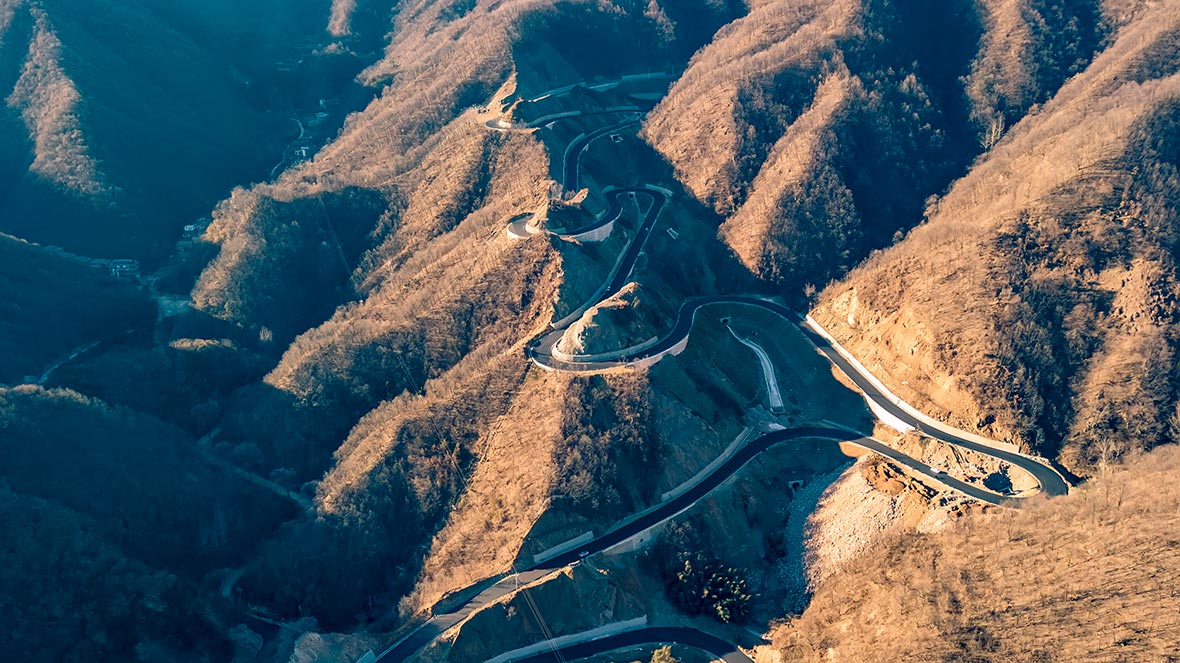 本项目起点位于鸭石村村委,路线沿鸭石至上庄村道改建至上庄,设置回头曲线抬升纵坡,以隧道穿越山脊后沿勺子沟布设连续回头曲线,接现有重渡沟景区内部道路,终点位于重渡沟景区内部道路农耕村停车场西侧220m处。